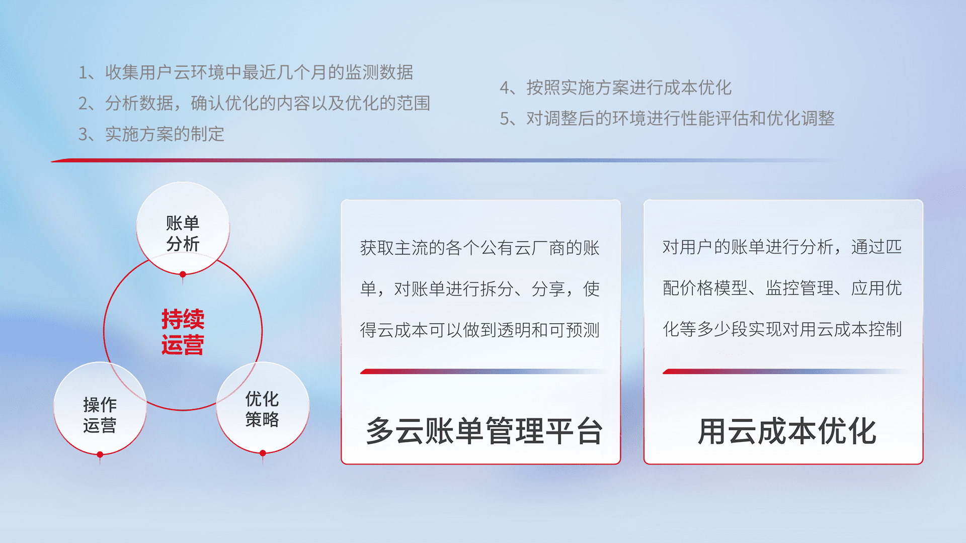 通过灵活运用多种自动化迁移工具,,,帮助企业用户实现业务和数据高效 、、稳定的上云迁移和云上迁移,,,采用自研多云纳管平台,,,以中立管理模式,,解决多组织、、、、多云、、多运维厂商的复杂关系的管理,,保证多云平台资源配置的一致性,,,实时掌控云资源运行数据,,,,运用智能化工具分析云资源多云平台的管理服务,,透明化管理成本支出,,,,用云成本可预测、、用云费用可优化、、、云资源配额有据可依。。。