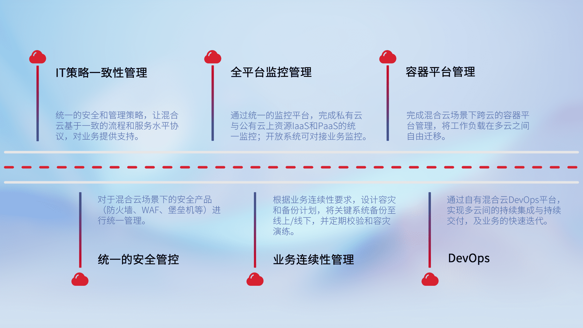 通过多云纳管,,以统一的资源数据模型把客户的云资源进行抽象和封装,,,,进而实现对多云资源的统一操作,,保障云资源管理的可靠性、、、稳定性与可用性。。量身定制化运维内容,,,配置、、、、开发运维、、、、补丁管理、、备份、、、、监控、、认证和访问管理、、、、审计和日常巡检等,,,,保障在用云过程中的可靠度,,,,稳定度以及高可用率。。