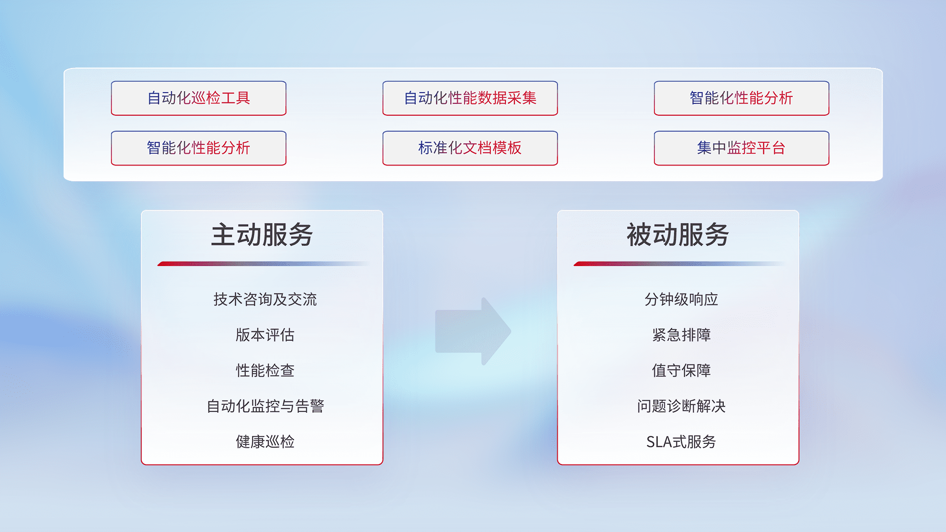 智能化工具和标准化文档,,,,保障服务质量,,提供主动服务(包含技术咨询、、、、版本评估、、性能检查、、自动化监控与告警、、、、健康巡检)和被动服务包含(分钟级响应、、紧急排障、、值守保障、、、、问题诊断解决、、、SLA服务)。。。。