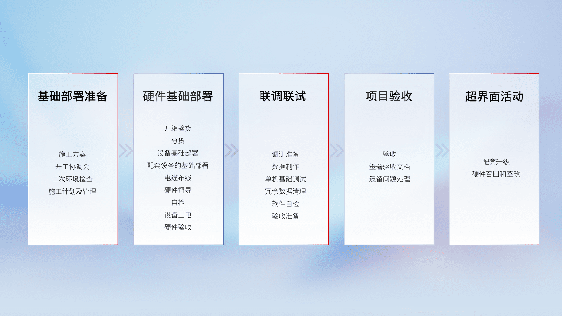 从基础部署准备、、硬件基础部署、、、联调联试、、、、项目验收、、、越界面活动的全过程可追溯,,,保证施工质量和进度。。