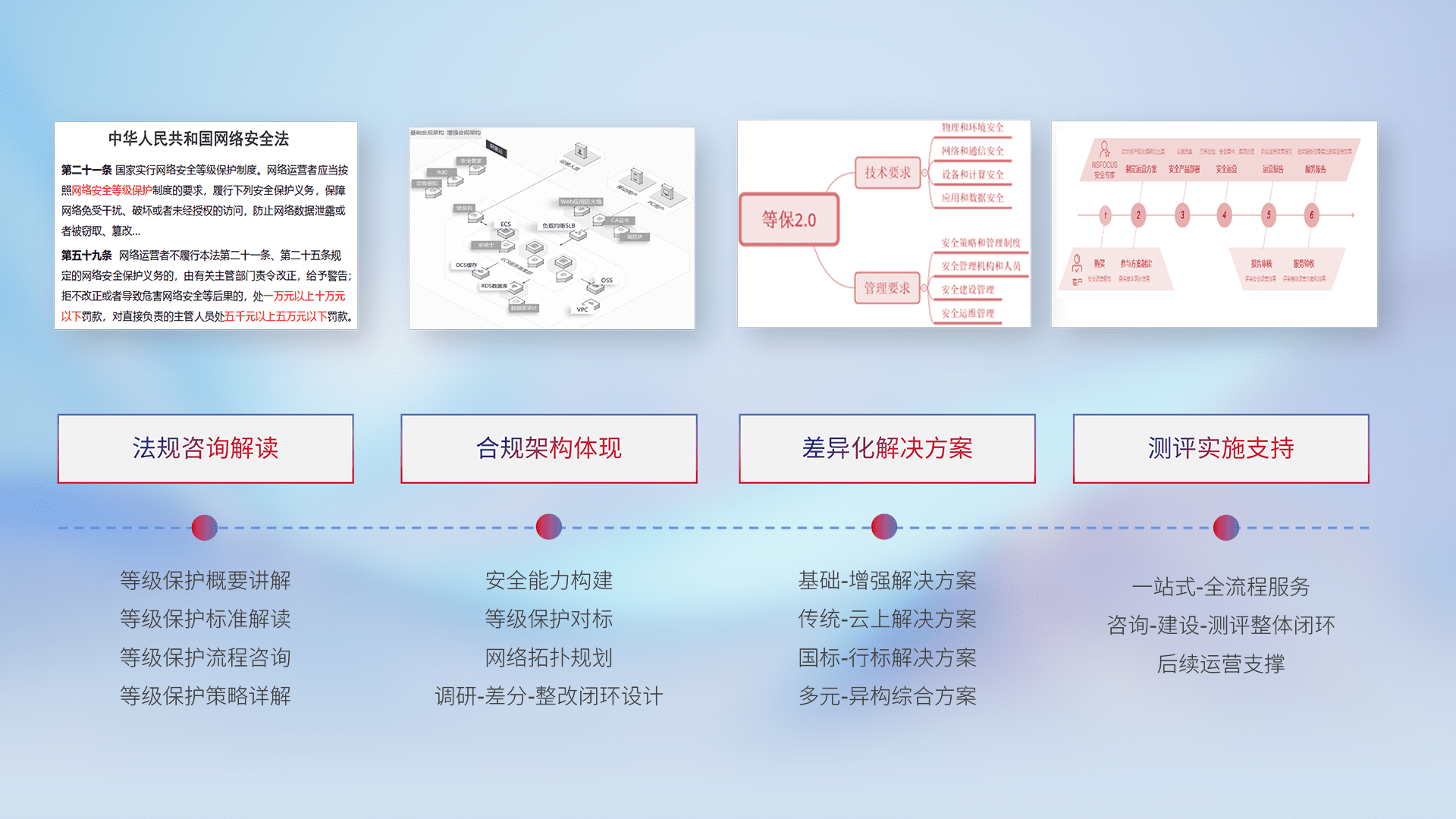 通过专业的法律咨询解读、、、合规架构体现、、、、差异化解决方案、、、测试实施支持等服务,,为客户量身打造等保合规体系。。